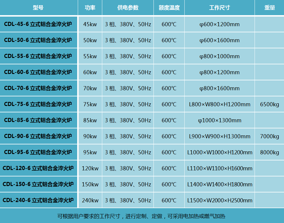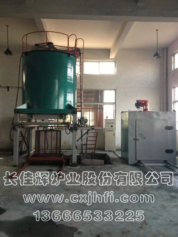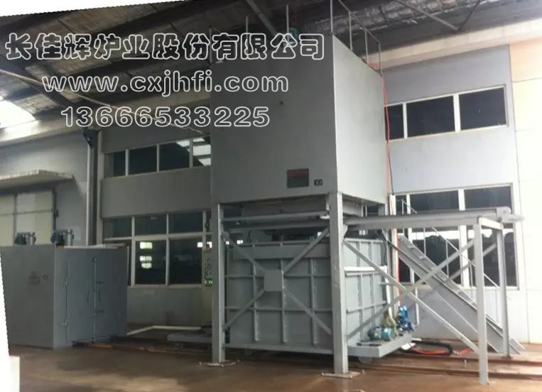 立式鋁合金固溶(淬火)爐 此設備可根據用戶要求進行定制、定做,服務熱線:13666533225 我公司生產的鋁合金固溶(淬火)爐有電加熱和燃氣加熱二種加熱方式,主要適用于鋁材焊接件、鋁鑄件及各種鋁合金產品進行淬火、固溶處理,工件的落水時間≤15秒。 操作流程:人工上料(推至預備位置)→爐蓋開啟→料勾下降→人工掛鉤→料框上升至加熱區→爐蓋關閉→根據產品工藝要求升溫、保溫→移動水池就位→爐蓋開啟→料框下降至移動水池內進行固溶→料框上升→移動水池退回→料框下降至平臺→(脫鉤)人工拉出→(整形處理后)推至時效爐進行時效處理。